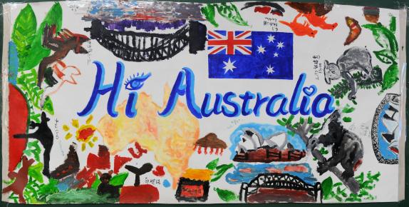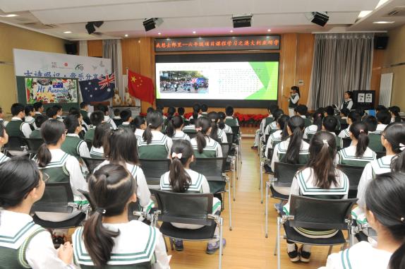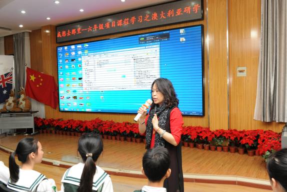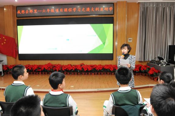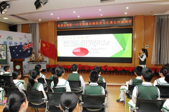 本次活动围绕道德、语言、科技、数学、艺术、健康六大领域开展课程研学。数学领域详细介绍了悉尼歌剧院的设计缘由及蕴含的数学原理,以及澳中空气质量对比等;艺术领域从澳大利亚土著艺术及当代艺术两个方面对音乐、绘画、雕塑等进行口头讲述和课件展示,其中用澳大利亚土著乐器演唱民谣的环节掀起了此次活动的第一次小高潮;语言领域通过生动活泼的视频、音频资料教授有关澳大利亚地域知识的英语词汇,学生们积极参与、台上台下互动频繁,再次将活动推向高潮;道德领域则从澳大利亚国旗入手,结合学生的生动展示介绍了澳大利亚国旗构成的相关知识,最后在国旗下宣誓唤起了在场全体学生的爱国意识;科学领域老师诙谐幽默的主持、学生生动活动的表演让大家在轻松的氛围中对澳大利亚的动物、植物有了更深的了解;体育领域则通过一段精心裁剪的澳大利亚特色体育运动rugby比赛视频号召大家热爱运动、更加健康、强大、自信。