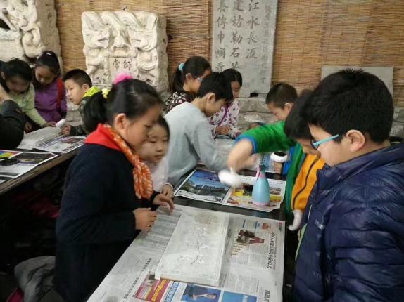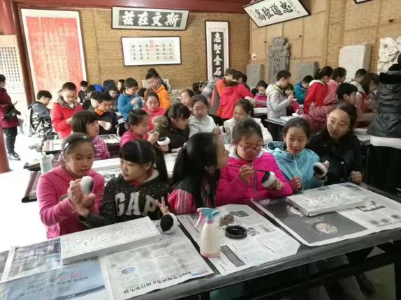 参观完毕,同学们还来到了拓片的教室。刚进屋,大家就跃跃欲试。在听完老师的讲解后,同学们开始兴致勃勃地做了起来。先把拓片工具中的其中一个涂好墨,然后与另一个工具轻轻拍打。接着,就可以在拓片用的纸上拓了。看着自己的作品,同学们特别有成就感