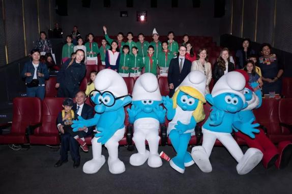 紧接着30名芳草学子在老师的带领下走进侨福芳草卢米埃影院观看《蓝精灵:寻找神秘村》主题电影,此次活动是接力出版社联手索尼哥伦比亚电影公司与芳草地国际学校合作组织的主题观影活动。比利时驻华大使马怀宇(Michel Malherbe)等一行人、接力出版社总编辑白冰和芳草地国际学校中国部30名学生及在京各大媒体记者参与了此次活动。